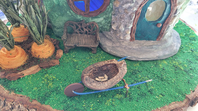 The wheelbarrow I made from a metal hanger, a button and a hickory shell I found on another of my walks. The glass in the windows was leftover from other projects or from old picture frames. The shovel I purchased at Hobby Lobby and the bench came from Pipkin’s Market. The Garden Center at Pipkin’s Market was a large selection of Fairy furniture and accessories.