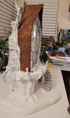 From there I finish out the structure with leftover cardboard, cereal boxes and scraps of foam core board. I also add the fairy lights & find places to fit the battery packs into the structure. Rocks that I collect on my evening walks are added to frame windows and wrap the chimney. Bits of paper egg cartons cover the stairs.